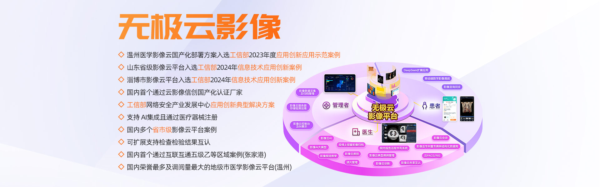 擁有多家年門診量400多萬以上人次的大型三甲醫(yī)院全院PACS及云影像案例,多個省市規(guī)模醫(yī)學影像云平臺案例,承建的溫州市醫(yī)學影像云平臺榮獲浙江省最多跑一次改革十佳案例、省領跑者定位題詞、全國惠民便民優(yōu)秀案例、基于影像云AI分析試點單位等榮譽。